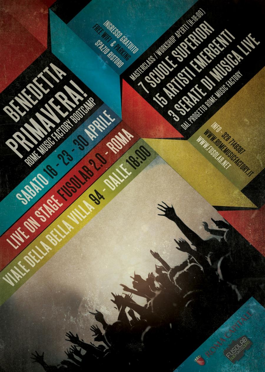 Qualcuno qualche anno fa cantava di una maledetta primavera in cui per innamorarsi bastava un'ora. Noi siamo più modesti vi faremo innamorare della nostra musica in sole 3 serate. I gruppi dei laboratori musicali dell'ITIS E. Fermi, dell'IIS Cine TV R. Rossellini, dell'IISS Leonardo da Vinci, del Liceo Artistico G.C. Argan, dell'ISS Pertini-Falcone, dell'ISS Carteso Luxemburg, dell'ITT Livia Bottardi sbocciano ed escono allo scoperto calcando il palco del Fusolab al grido di BENEDETTA PRIMAVERA! 5 gruppi per serata inizio concerti ore 21 puntuali, una possibilità per conoscere e scoprire la musica emergente che nasce e cresce nelle scuole romane. Vi chiediamo di supportarci e sopportarci in un solo modo: venite ad ascoltarci il 16, 23, 30 Aprile.